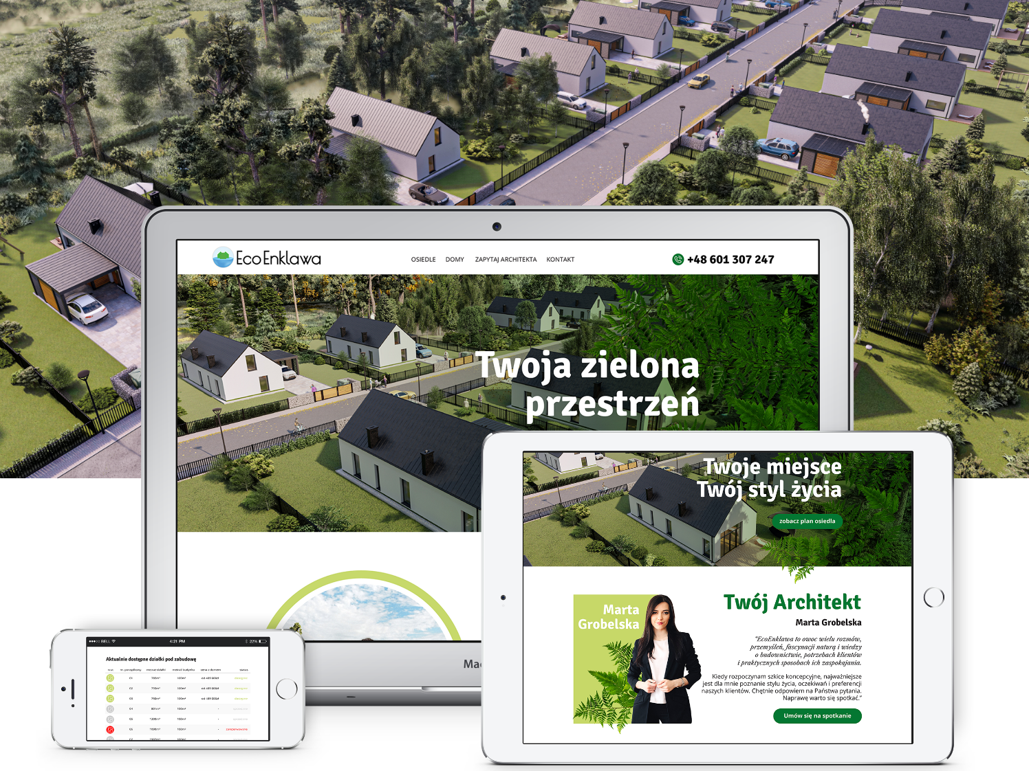 i pomieszczeń, możliwość konsultacji z architektem czy status dostępności poszczególnych działek wraz z domami. Klient ma możliwość modyfikowania poszczególnych podstron przy pomocy intuicyjnego interfejsu oraz systemu zarządzania dostępnością mieszkań.