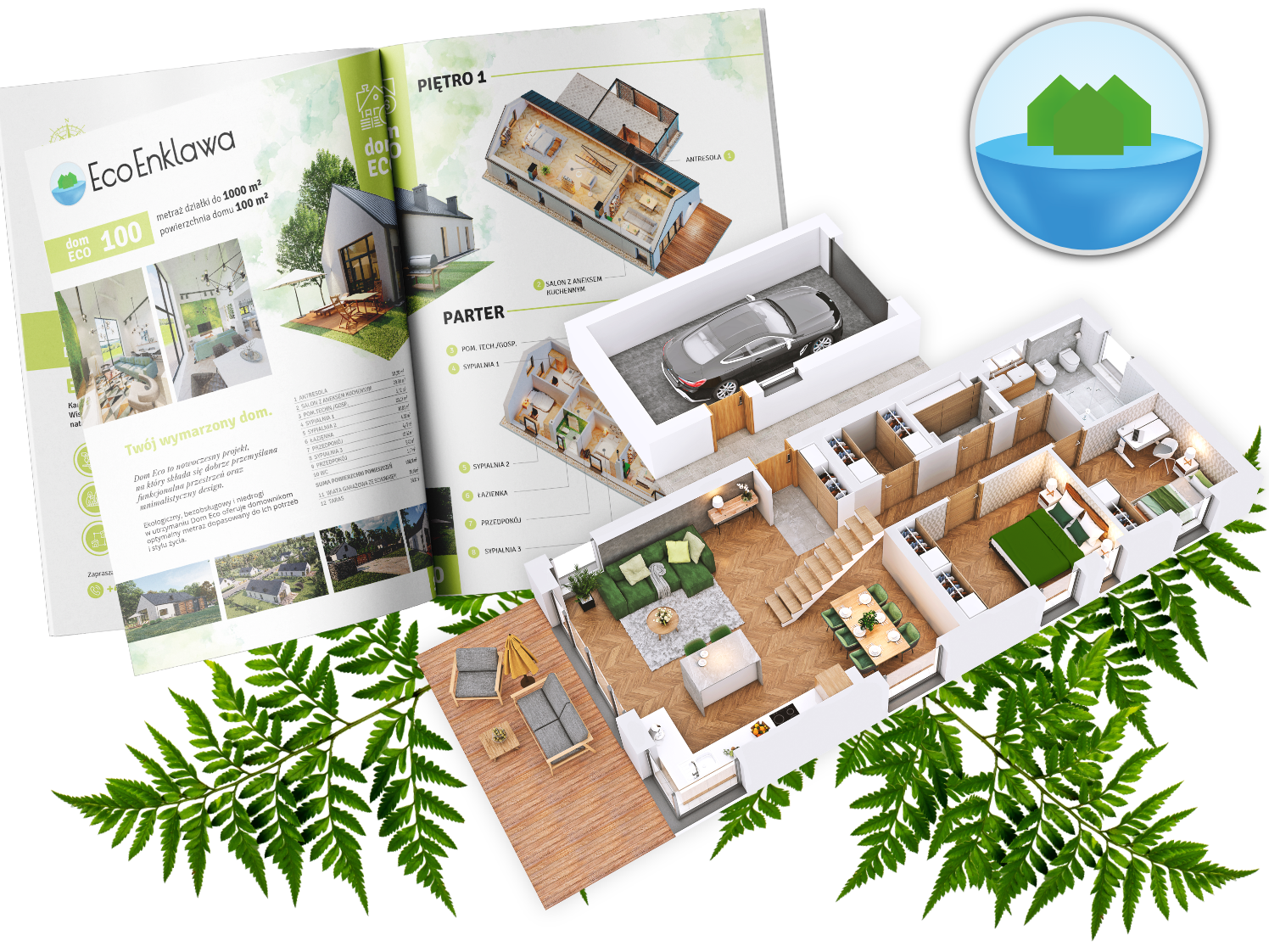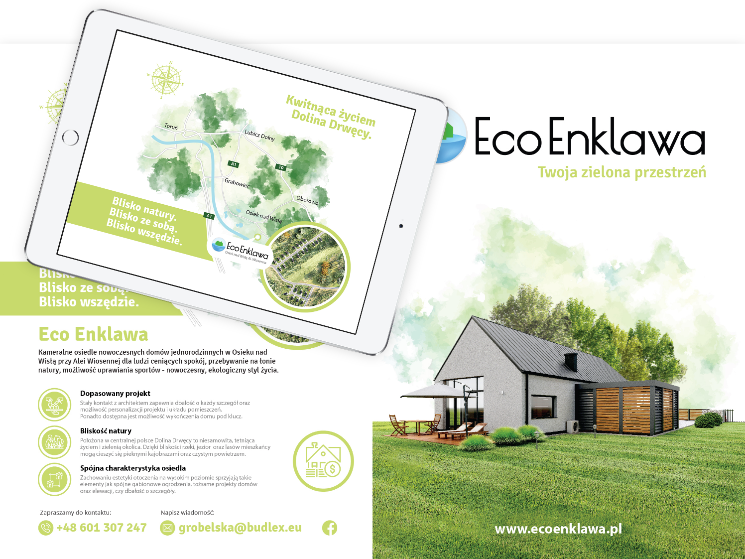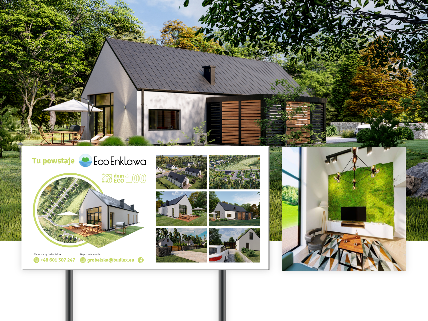o uporządkowanej strukturze, składającego się z wielu sporej wielkości domków jednorodzinnych ujęła nas dążeniem do perfekcji i z pewnością zasługiwała na nowoczesne obrandowanie. Niezwykle ważnymi elementami wizualnymi były dla nas w tym wypadku dobre wizualizacje nie istniejących jeszcze budynków oraz przedstawienie ich wnętrza wraz z aranżacją poszczególnych pomieszczeń. Tak zaprezentowana wizja zwiększyła sprzedaż domków już w pierwszych